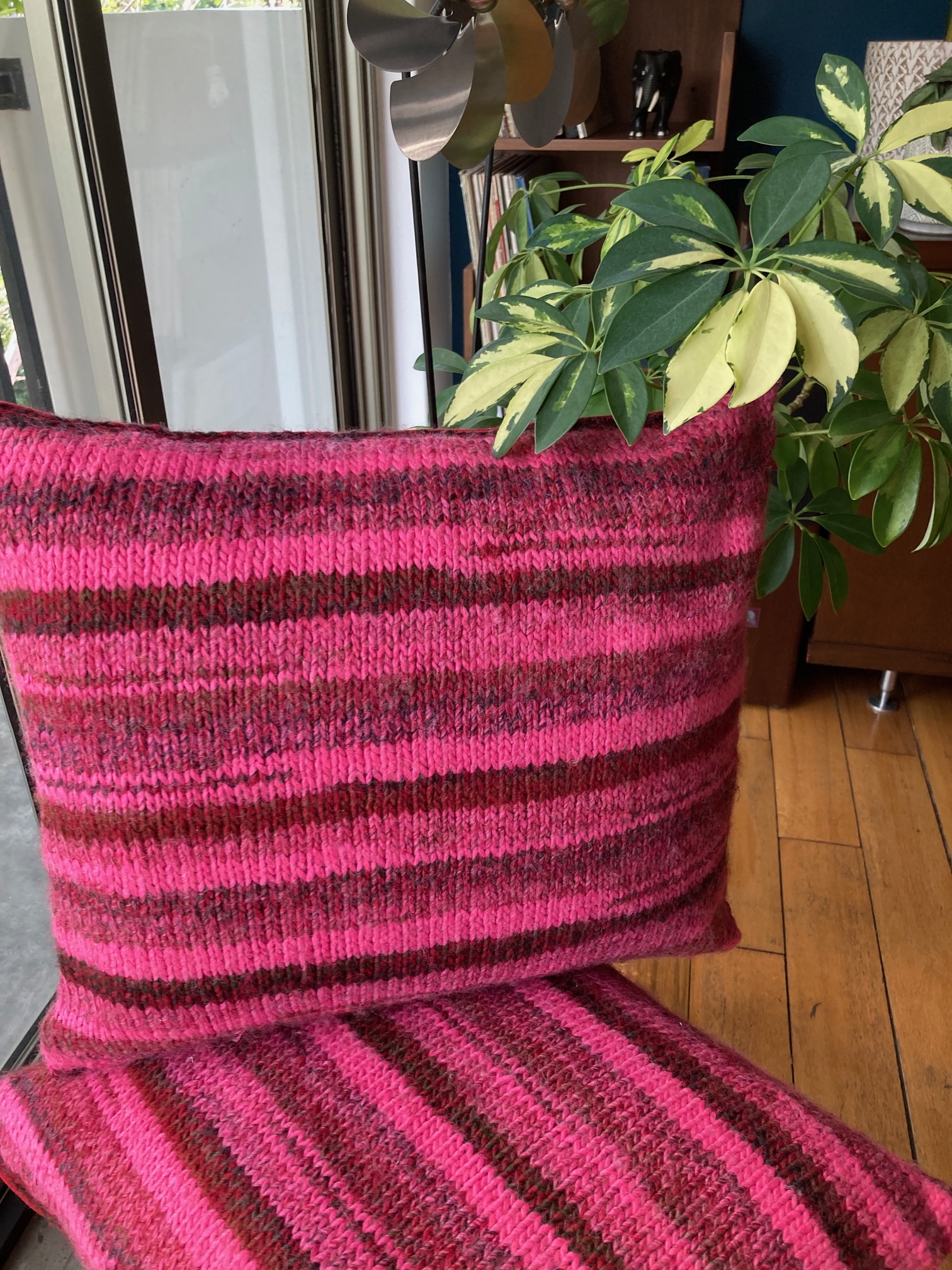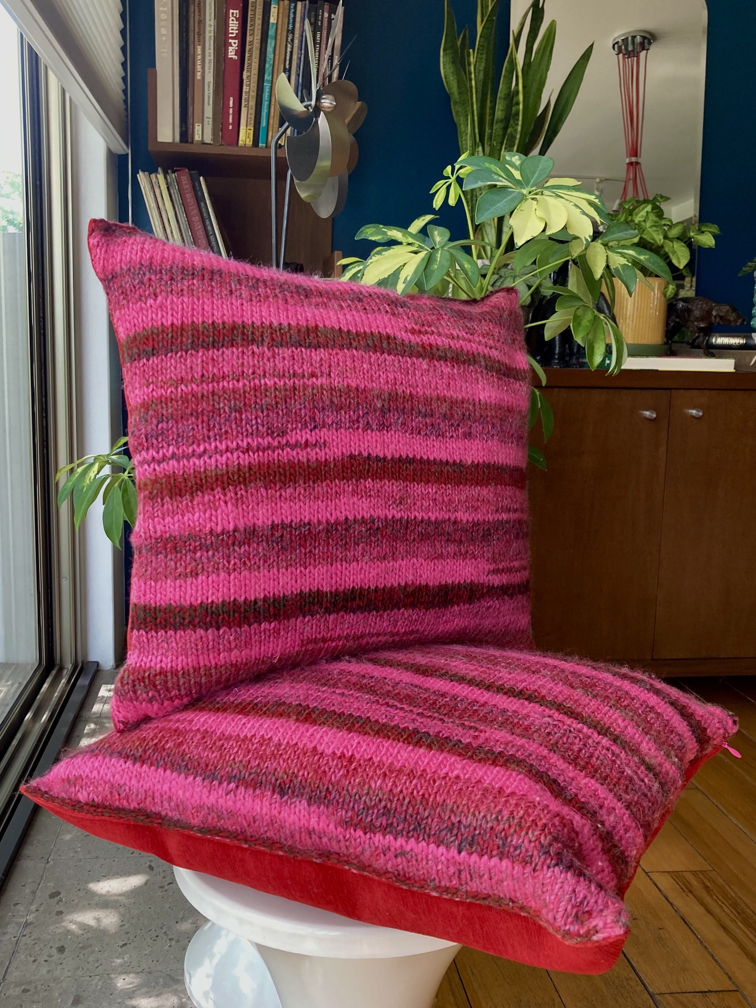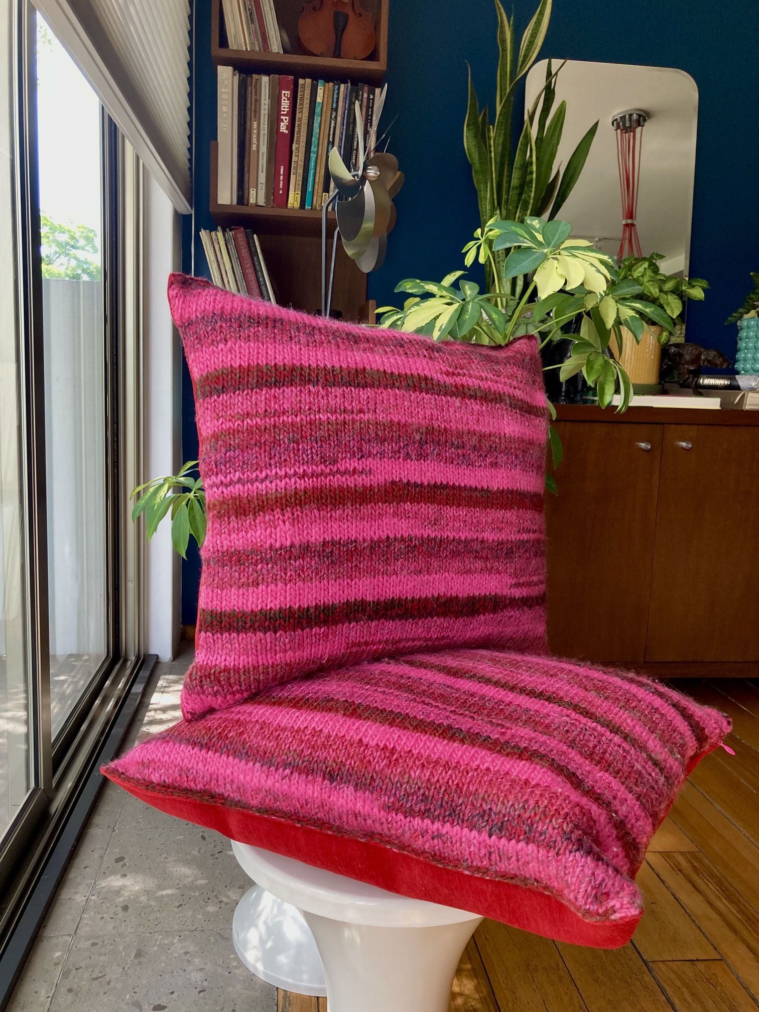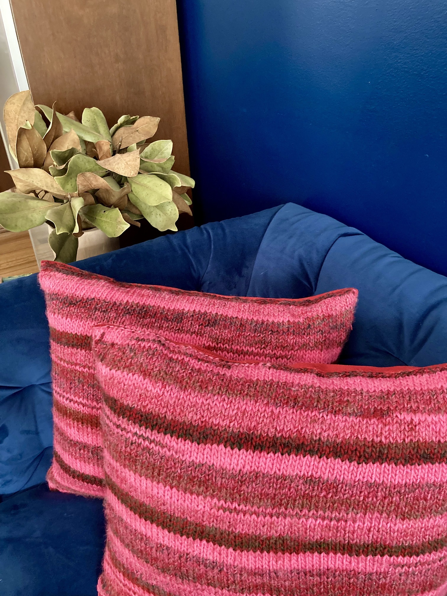 - Dos cojines tejidos en dos agujas con puntada jersey que luce siempre muy elegante