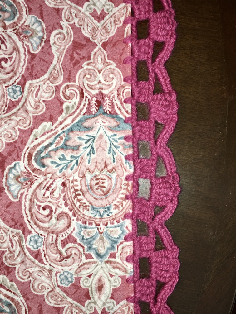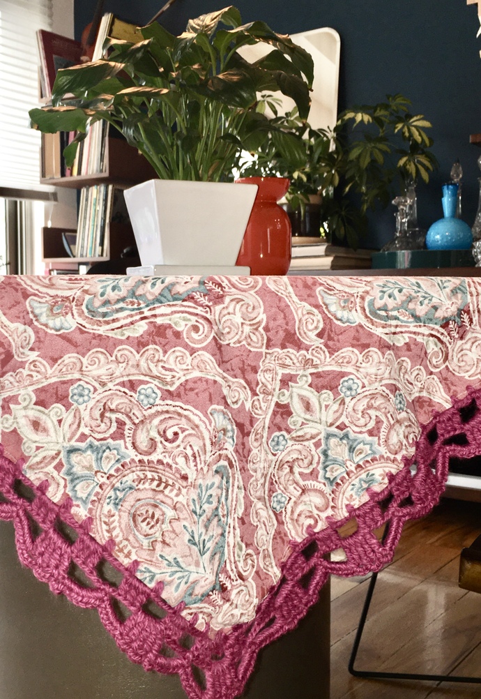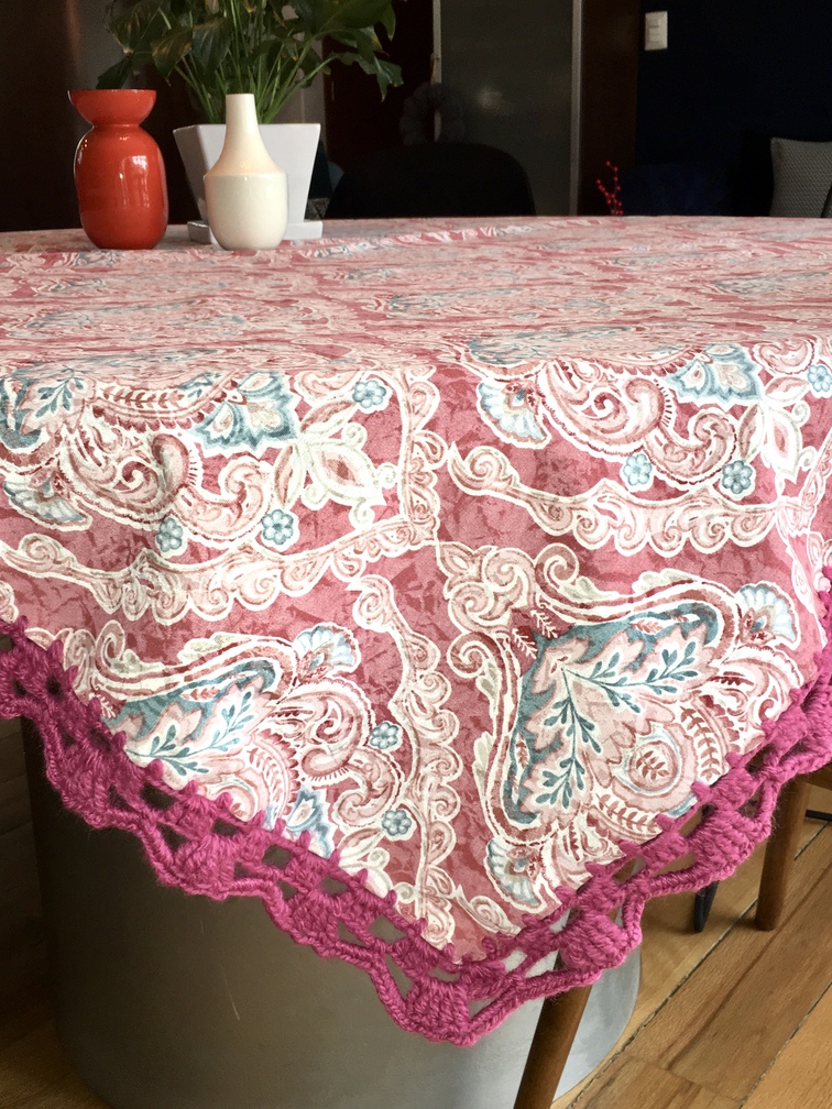 El borde con detalle de crochet en rosa complementa perfectamente el diseño, añadiendo un toque de delicadeza y artesanía a tu mesa.